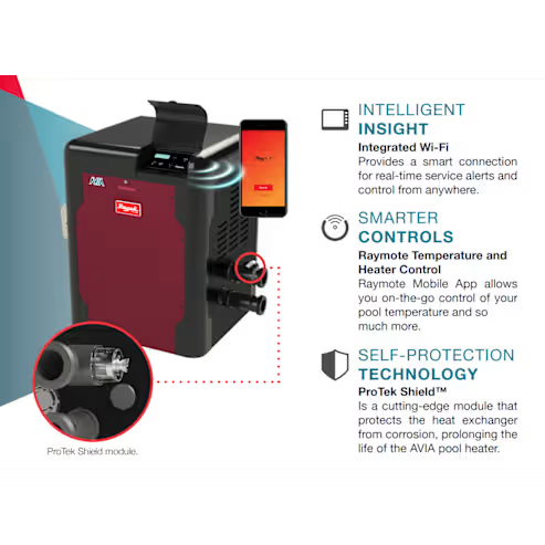 Experience unmatched convenience and control with the Raypak AVIA 266,000 BTU Natural Gas Pool Heater—the intelligent solution for year-round comfort in your in-ground residential pool. Designed for smart automation and long-lasting performance, AVIA integrates Wi-Fi directly into the heater, eliminating the need for additional control systems.